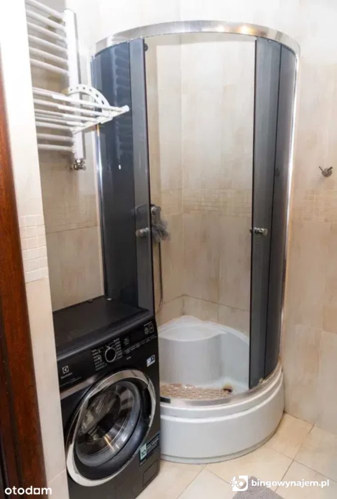 Łazienka: prysznic, umywalka z szafką, pralka, toaleta.