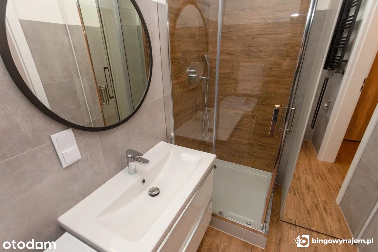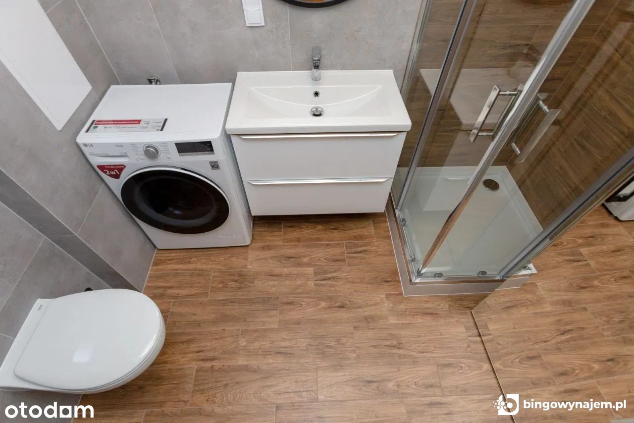 Łazienka: kabina prysznicowa, toaleta, szafki łazienkowe, lustro, pralko-suszarka
