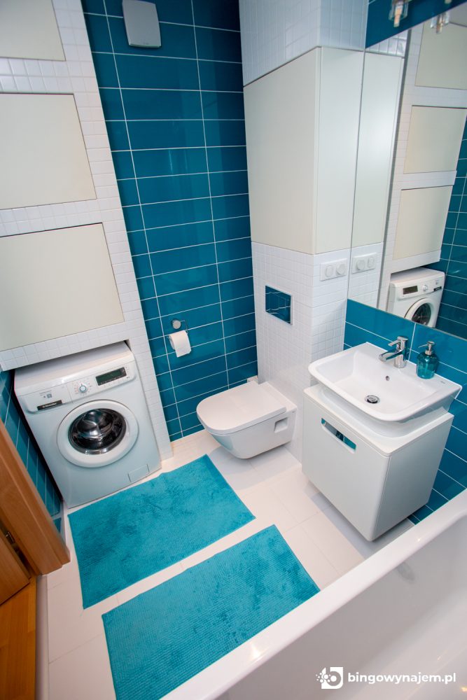 Łazienka: toaleta, pralka, wanna, umywalka, szafki łazienkowe