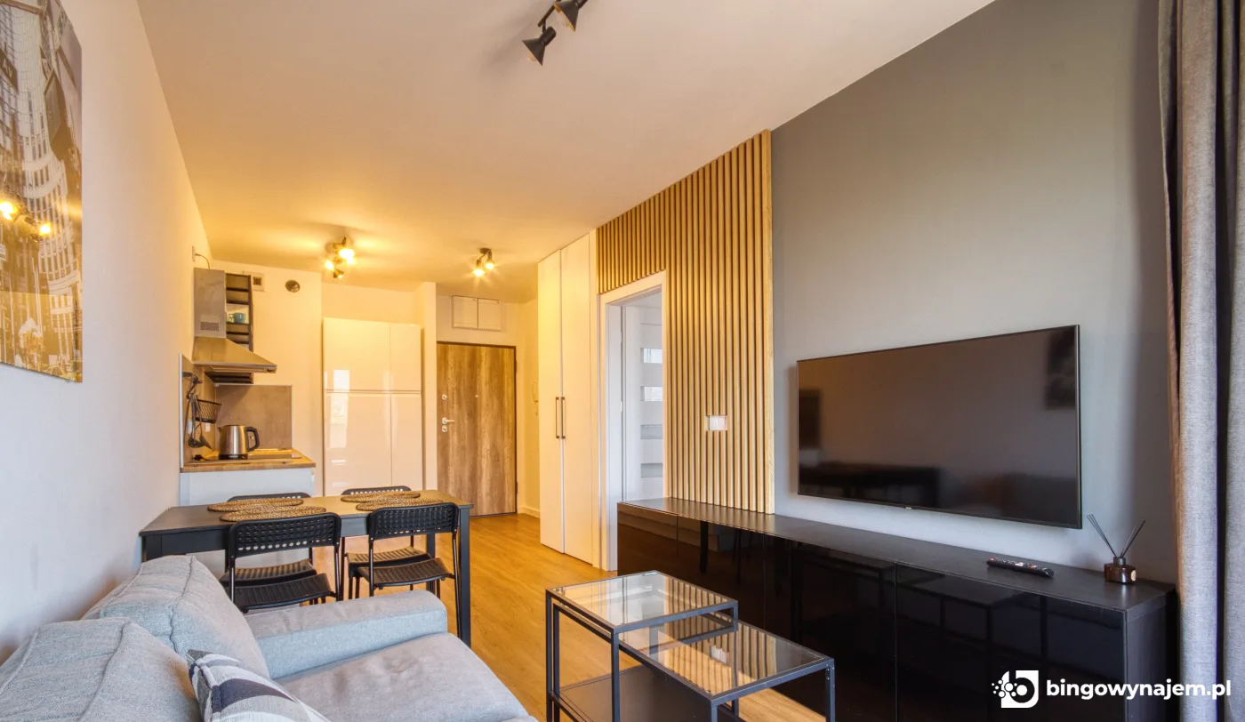- Umeblowane i w pełni wyposażone (aneks kuchenny z AGD, salon z sofą i TV, sypialnia z łóżkiem i szafą, łazienka z prysznicem i pralko-suszarką)